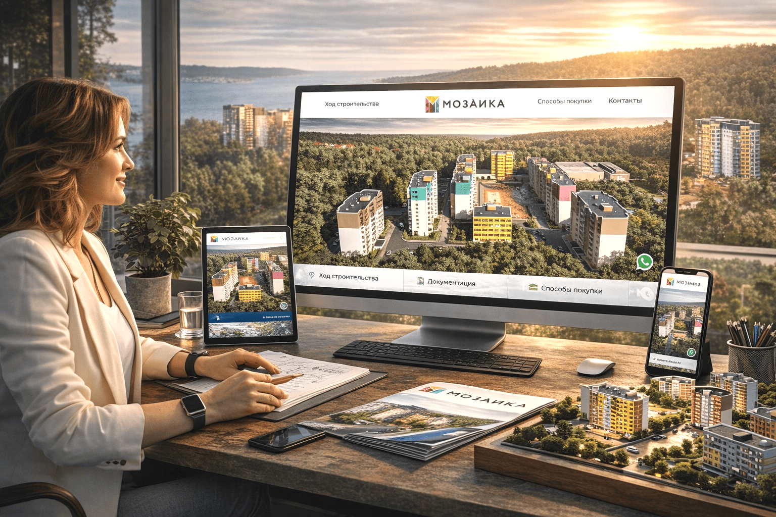 Панорамный взгляд с высоты раскрывает пространство, воздух и уверенность проекта, визуально подчеркивает масштаб застройки, усиливает ощущение надежности и статуса, формирует эмоциональное доверие и мягко подталкивает клиента к решению о покупке и общению с девелопером. Разработка сайта Тольяттистройзаказчик.рф и его раскрутка в Яндексе выполнены веб-студией РОСТСАЙТ.