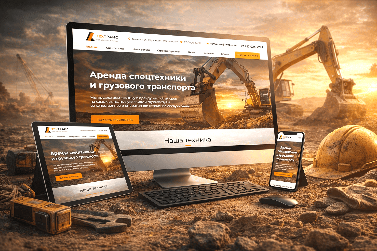 Главная страница Техникатранс.рф сразу показывает ключевое для заказчика: техника в работе, масштаб, момент нагрузки, готовность к выезду. Этот визуальный фокус переводит разговор из плоскости «поиск подрядчика» в плоскость «запуск задачи», снижая время на принятие решения. По данным исследований Nielsen Norman Group, лучшие сайты для строительных компаний повышают первичную конверсию в целевое действие на 19–24 %, поскольку клиент сразу видит результат, который он покупает. Разработка интерфейса и SEO-оптимизация выполнены специалистами РОСТСАЙТ